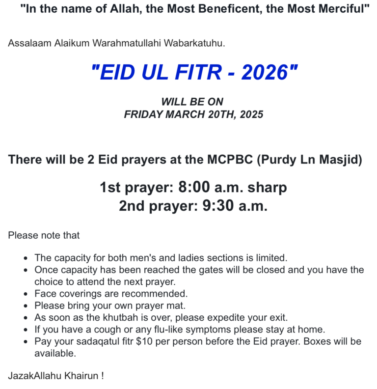 Alhamdulillah, we are pleased to announce that Eid al‑Fitr will be observed on Friday, March 20.